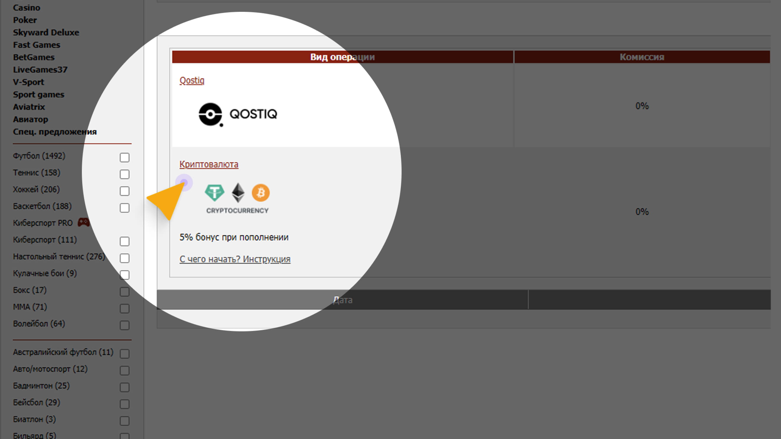 Перейдите в раздел «Касса/Пополнить» → выберите метод «Криптовалюта».