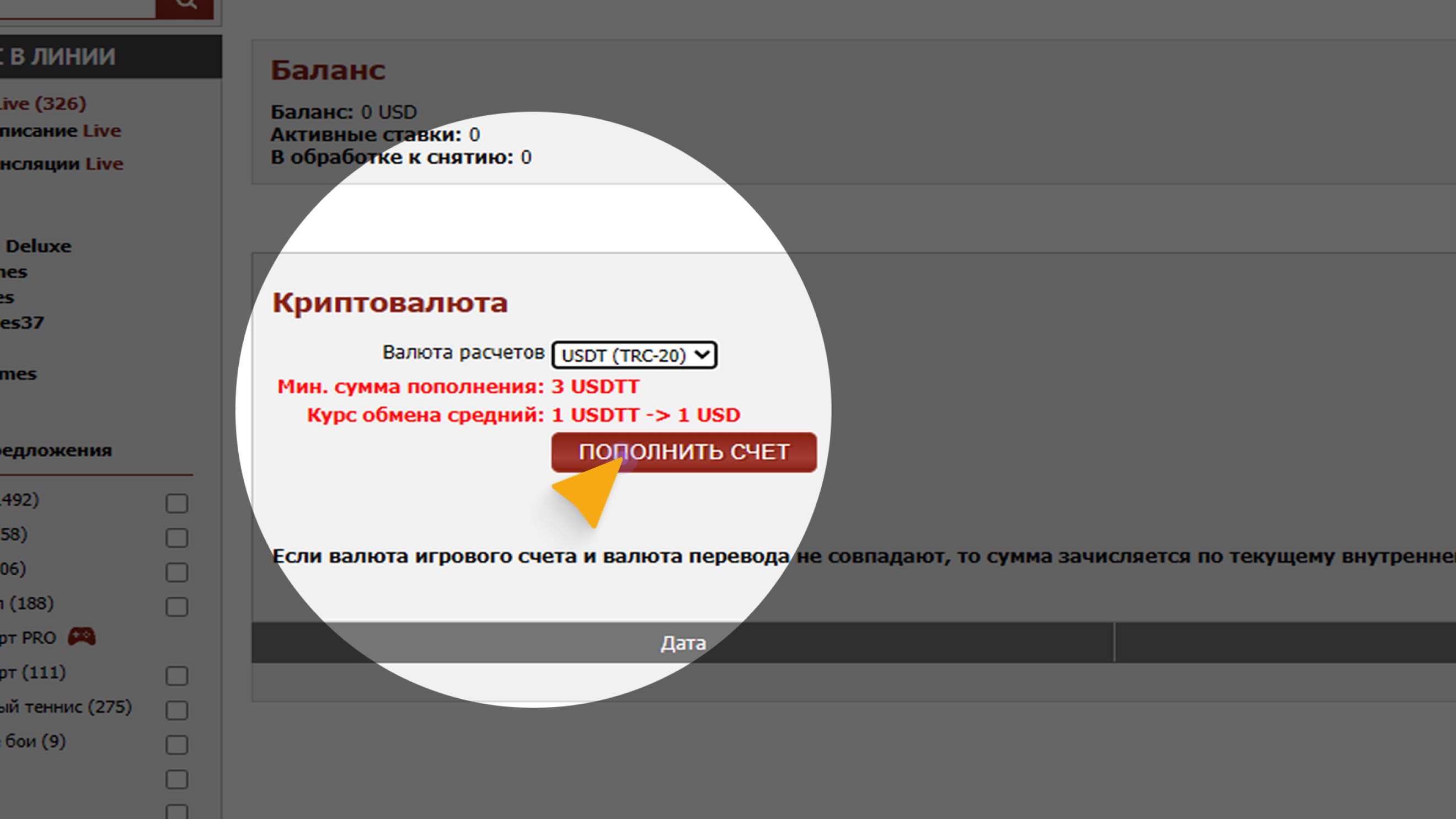 Выберите нужную криптовалюту из списка. Система покажет актуальный курс и минимальную сумму депозита.