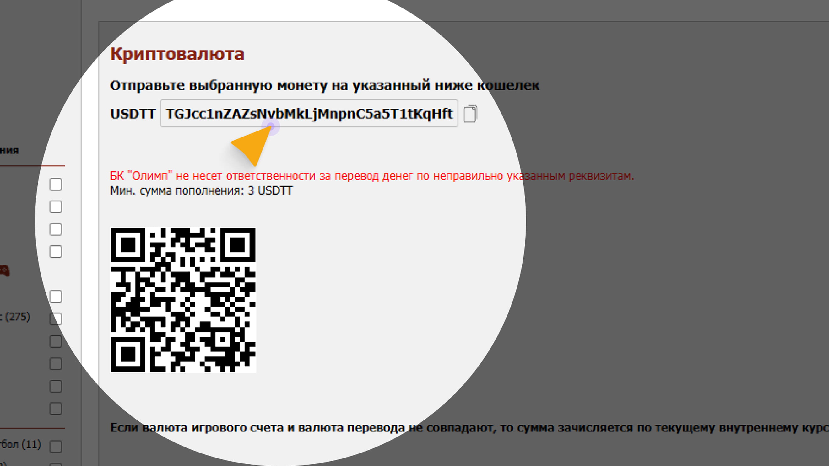 После подтверждения вы получите персональный криптокошелёк и QR-код. На этот адрес нужно отправить криптовалюту. Кошелёк привязывается к вашему аккаунту и используется для всех последующих пополнений.