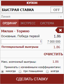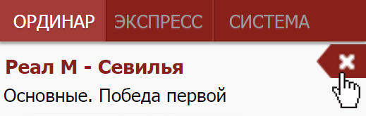 При выборе нескольких исходов, все они будут добавляться в Купон, где Вы можете выбрать вид ставки: Ординар, Экспресс или Систему.