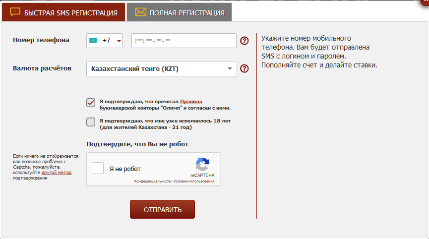 Пожалуйста, внимательно ознакомьтесь с Правилами перед заполнением регистрационной формы. Лица младше 18 лет или проживающие на территории, где запрещены азартные игры, не могут регистрировать счет в «Олимпе». Пользователь может иметь только один счет. Любая заявка на создание повторной регистрации будет отклонена.
