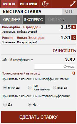 После добавления исходов в Купон, можно выбрать вид ставки: Экспресс или Система: