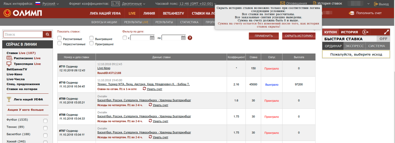 Скрытие истории ставок возможно только при соответствии логина следующим условиям: