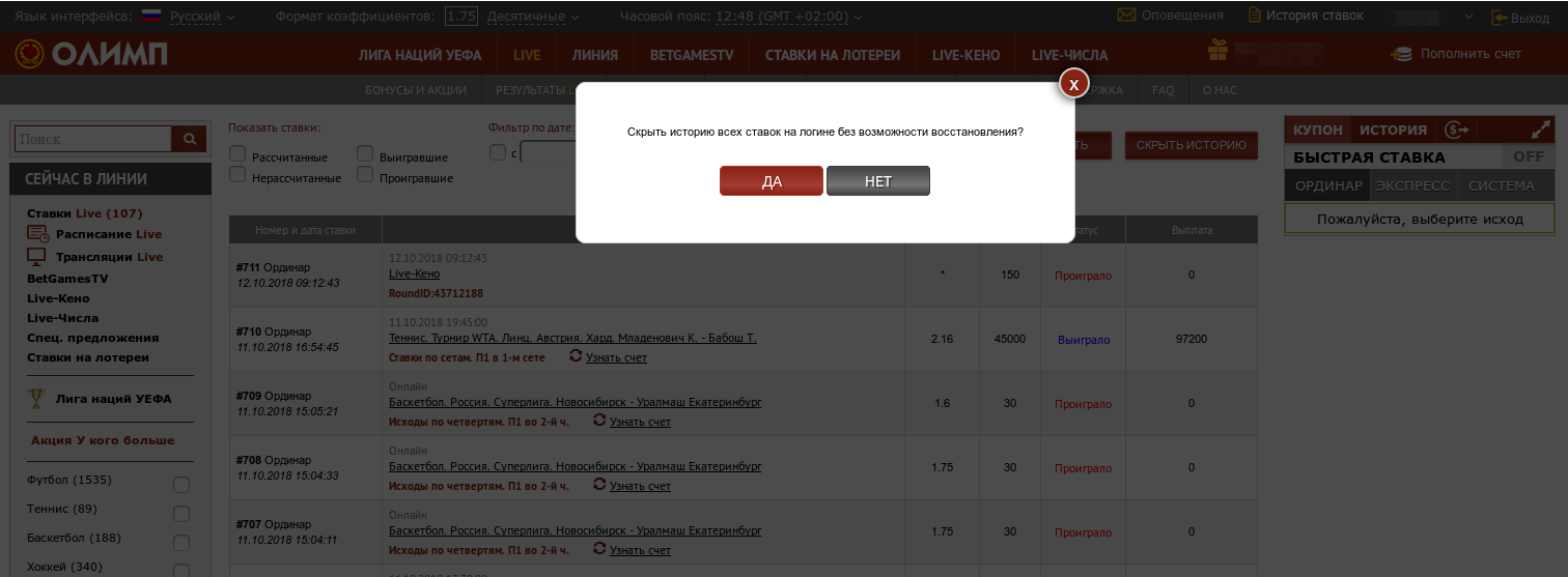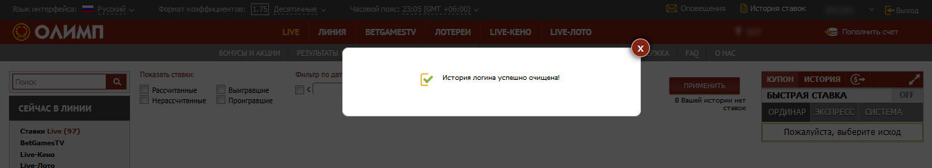 Как скрыть историю ставок? Вы можете скрыть историю ставок самостоятельно на Вашем логине в разделе “История ставок” с основной версии сайта. ![]()
