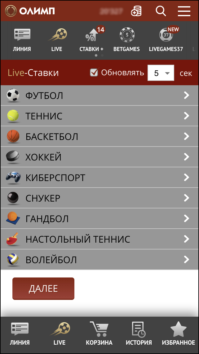 Вы можете открыть коэффициенты на каждый матч, нажав на кнопку «+» с цифрой справа от названия матча. Цифра обозначает количество исходов, предлагаемых на этот матч. Также Вы можете выбрать несколько событий, поставив галочки напротив интересующих Вас событий, и нажать кнопку «Далее».