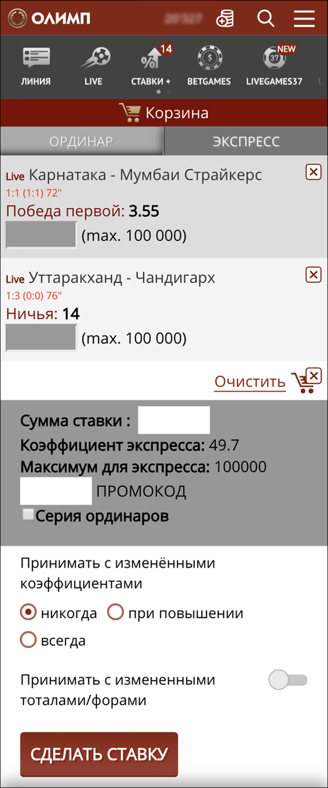 Обратите внимание, что коэффициенты, предлагаемые на события Live, меняются по мере развития игры, что означает, что выбранный Вами коэффициент может увеличиться или уменьшиться за то время, пока Вы делаете ставку. Если Вы хотите сделать ставку независимо от изменения коэффициентов, выберите пункт «Всегда» для «Принимать с измененными коэффициентами» перед подтверждением ставки. Также, если Вы хотите сделать ставку независимо от изменений значения форы или тотала, перед подтверждением ставки включите функцию «Принимать с измененными форами/тоталами».