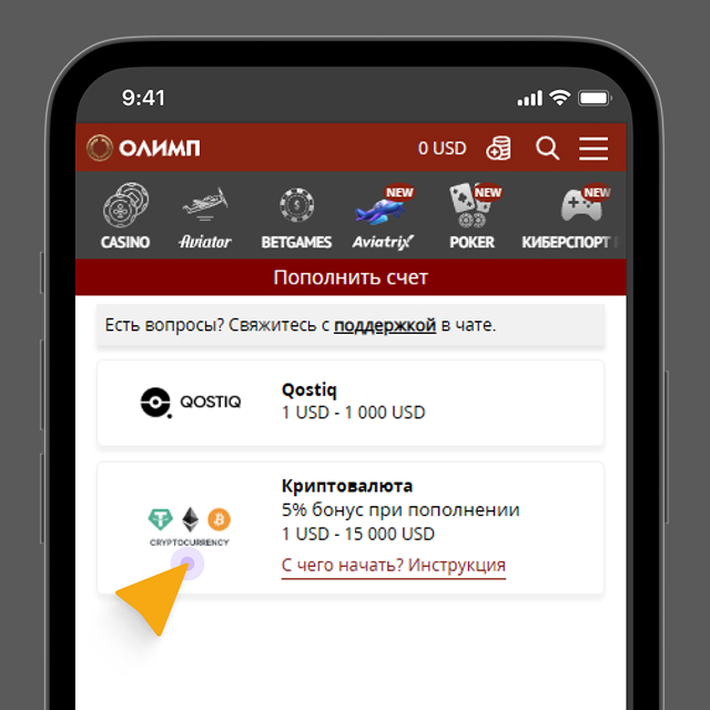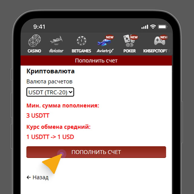 Перейдите в раздел «Касса/Пополнить» → выберите метод «Криптовалюта»