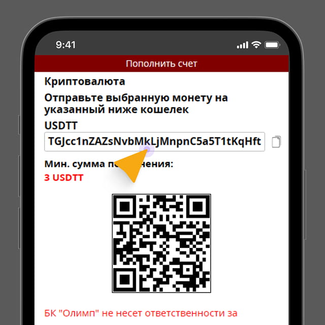 После подтверждения на странице отобразится Ваш персональный криптокошелек для той монеты, которую Вы выбрали ранее. Адрес кошелька можно скопировать или воспользоваться QR-кодом.